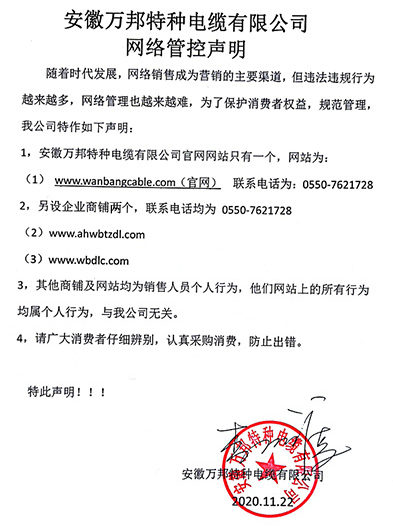 鄭重聲明:安徽萬邦特種電纜有限公司官方網站為:www_wanbangcable_com.jnhdfy.com,除此之外無任何子網站或合作網站,其余均為假冒偽劣。電話:0550-7621728 13485756353 地 址:安徽省天長市滁州高新技術產業開發區經四路29號